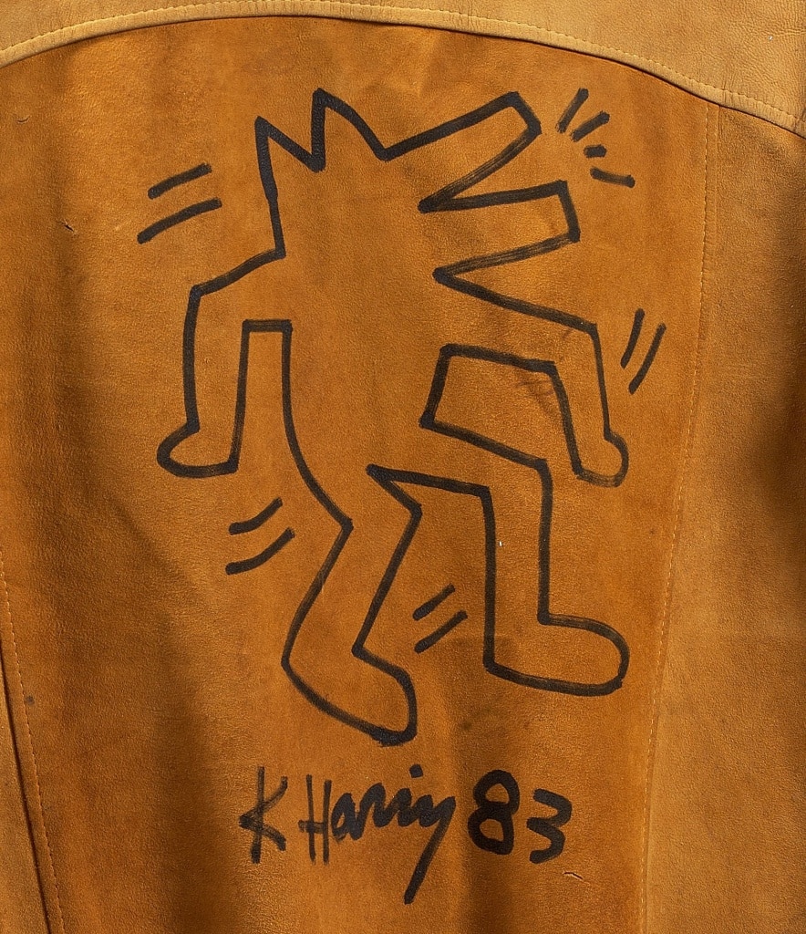 To begin with, the suede jacket drawn during the Montreux Jazz Festival in 1983 exemplifies Haring’s direct engagement with live cultural environments. Rather than treating the jacket as a purely functional garment, Haring transformed it into an active artistic surface. Using black marker, he drew a dynamic figure on the back, closely aligned with his broader interest in movement, rhythm, and performative space. Furthermore, the jacket’s documented origin, combined with the artist’s signature and date, firmly anchors the work within a specific historical moment. The accompanying certification agreement issued by the Keith Haring Foundation further reinforces its authenticity and market significance. It is a rare collectible that intersects art history and wearable art.