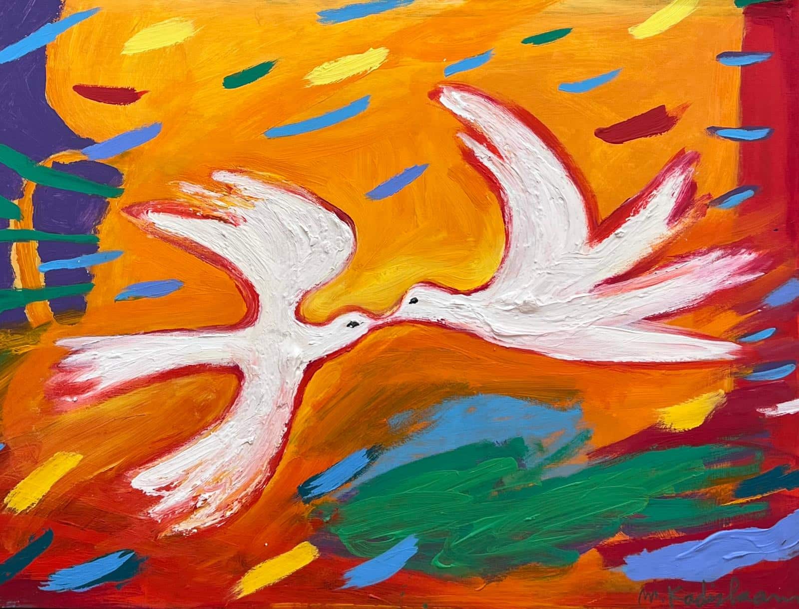 The Kiss by Menashe Kadishman instantly grabs your attention. Two white doves soar across the center of the canvas.